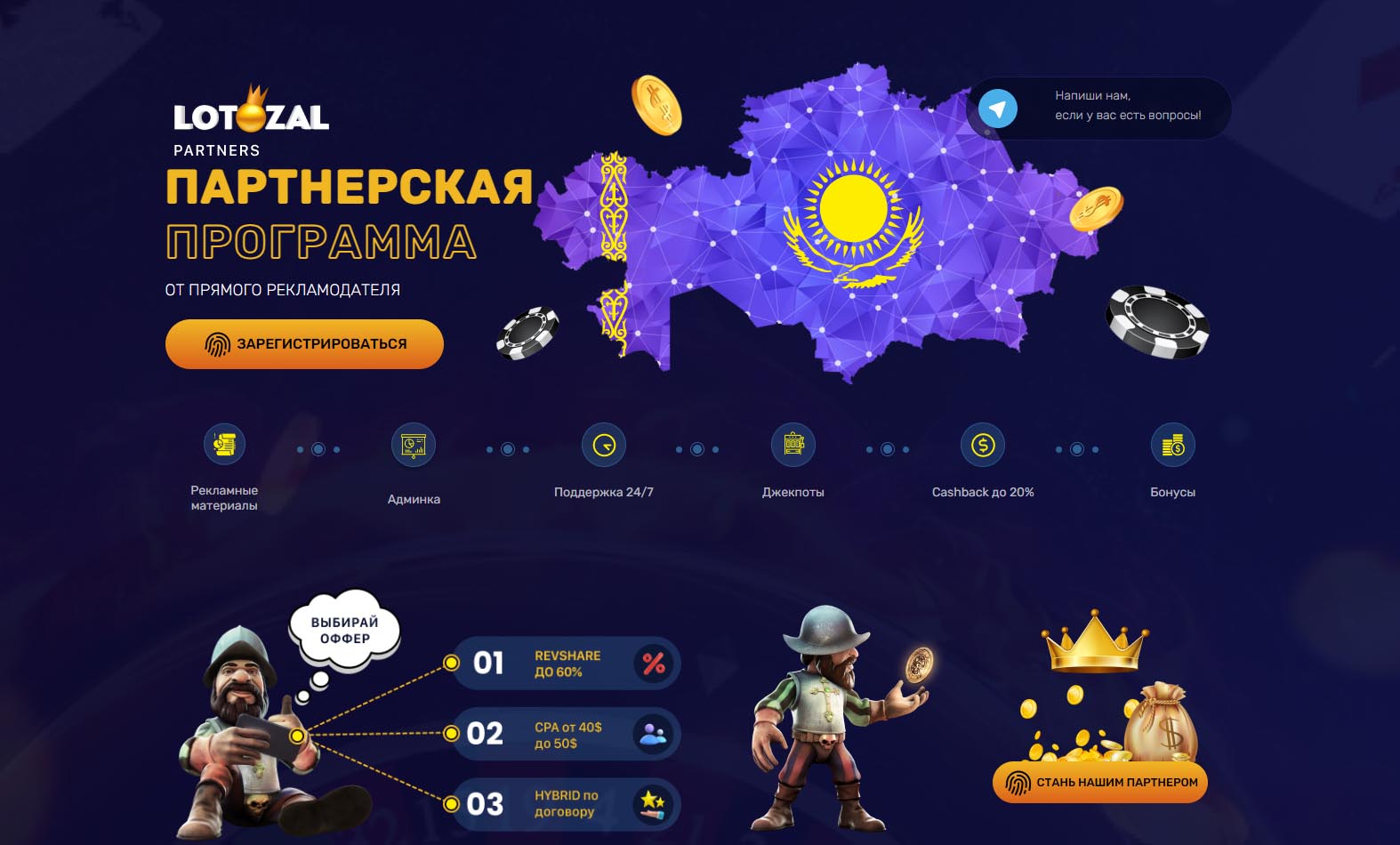 LOTOZAL PARTNERS — партнёрская программа (официальный прямой рекламодатель) бренда Lotozal. Работает с тематикой онлайн-казино. Условия сотрудничества: RevShare до 60%, CPA до 50 USD, Гибрид обсуждается индивидуально. Выплаты производят 2 раза в месяц. Отрицательный баланс переносится (NCO). Брендовый трафик принимается (разрешен). Далее детально рассмотрим партнёрку LOTOZAL PARTNERS.