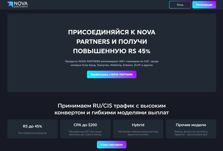 Партнёрская программа NOVA PARTNERS не принимает брендовый трафик, что стоит учитывать при планировании сотрудничества. Она работает на собственной платформе (в простонародии In-house).