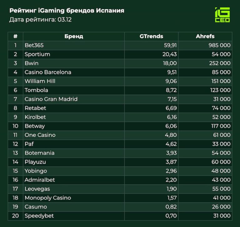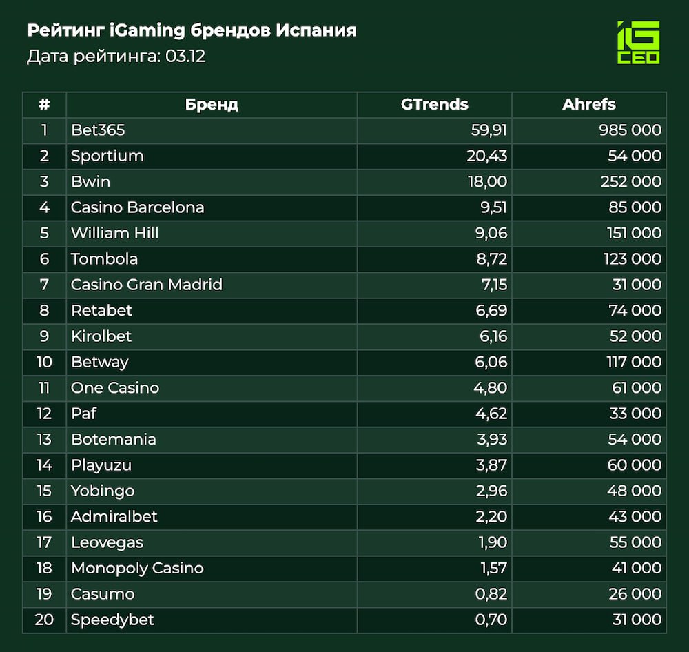 За последние 30 дней было сделано около 2,3 млн. запросов по топ-20 iGaming брендам Испании.