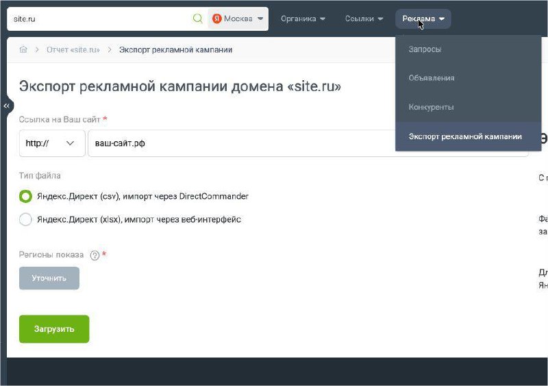 - Экспортируем через кейсо рекламные кампании (РК) конкурента