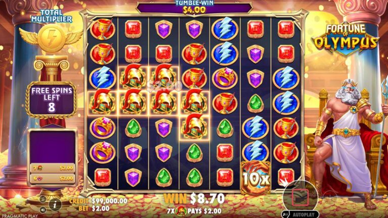 Главное отличие от классического олимпуса — в бонуске накопленный множитель применяется ко всем выигрышам, а не только к тем, где во время спина выпал множитель на поле.