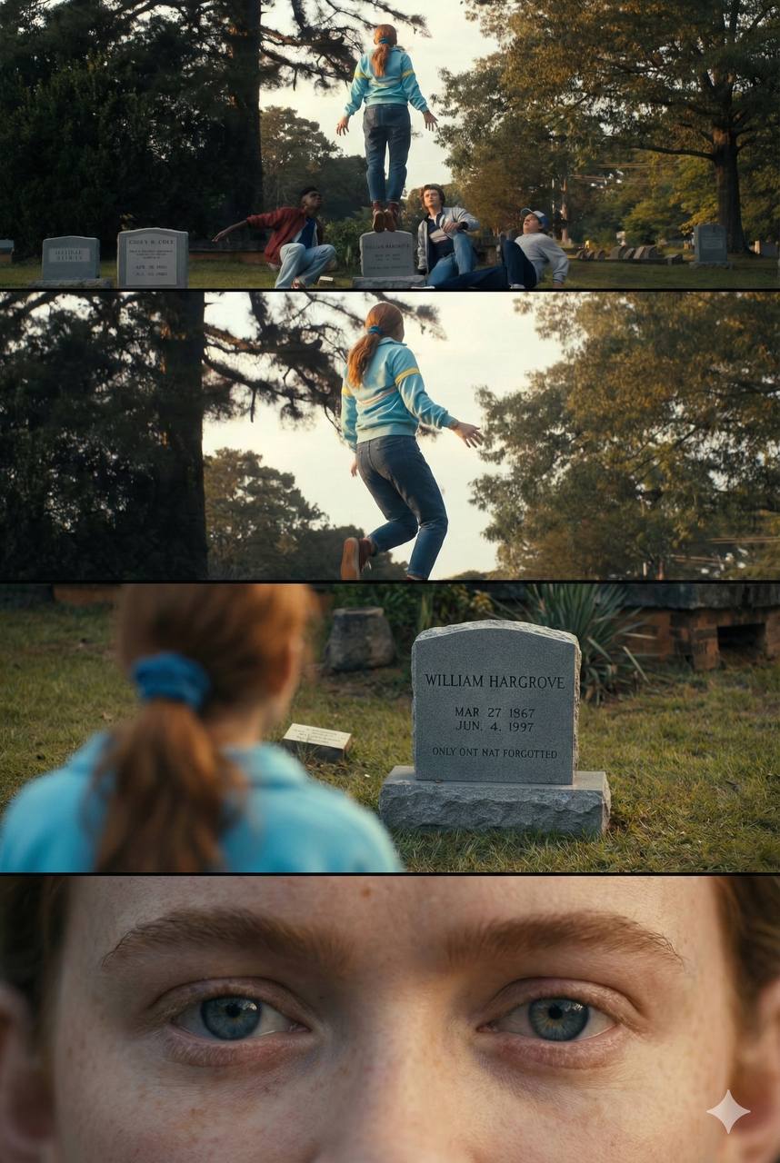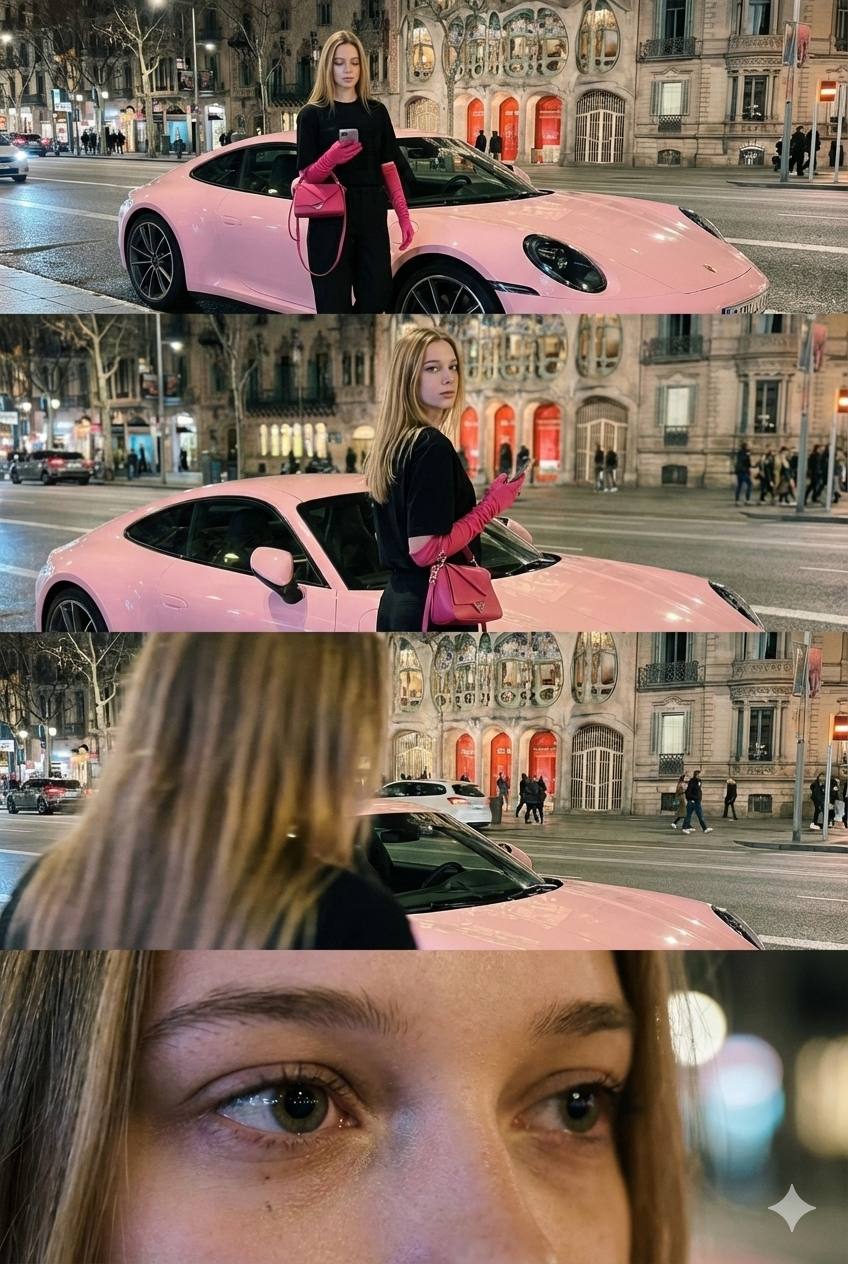 Create a vertical cinematic contact sheet divided into 4 stacked frames based strictly on the uploaded reference image. Seamless Stacking: The images must be stacked vertically edge-to-edge. Do NOT create any visible borders, white margins, film strips, or dividers between frames. Preservation: You must PRESERVE all original objects, props, and background details from the reference. Do not remove or hide existing items. Consistency: Maintain exact character identity and outfit. Do not change the location. Style: High-end 35mm film stills, photorealistic, natural grain, volumetric lighting. No CGI or illustration style. [Frame 1 — Top] Ultra-wide establishing shot. Subject caught mid-transition, entering frame or shifting weight. Candid, accidental look with atmospheric depth. [Frame 2 | Dynamic Medium] Medium shot. Sense of motion, fractional time shift. Subject turns head/shoulders mid-reaction, unposed. Dominant clothing texture: emphasize folds, fabric weight, and light response. Shallow depth of field creates modern editorial look. «Screenshot-worthy.» [Frame 3 | Over-the-Shoulder] Over-the-shoulder cinematic shot, fractional time shift. Camera close behind subject, compressing space. Focus shifted to a specific environmental detail from the reference. Foreground shoulder/hair blur adds depth. Narrative tension: curiosity/anticipation vibe. [Frame 4 — Bottom] Extreme macro close-up focusing on eyes and skin texture. NO smoothing—show real pores and fleeting micro-expression. Shallow depth of field.