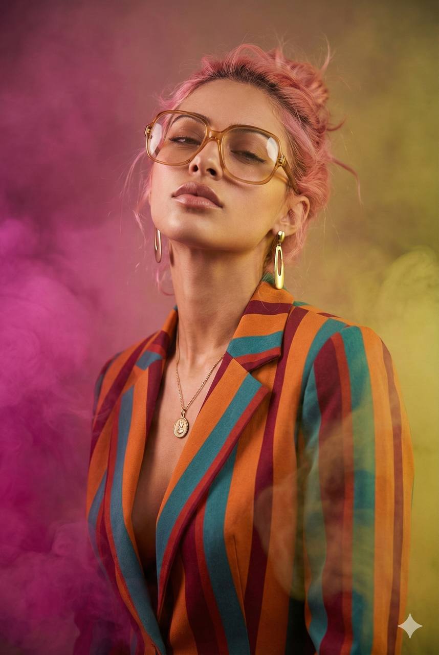 Studio lighting, soft frontal key with gentle side fill. Volumetric fog: dense magenta smoke on the left and rich yellow-green haze on the right, softly wrapping the subject without obscuring the face. Warm color grading, retro 80s fashion editorial mood, dreamy cinematic atmosphere, clean magazine finish.