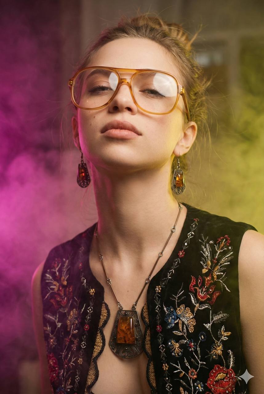 Use the uploaded selfie as the ONLY facial identity reference. Preserve exact facial geometry and natural expression. Facial likeness has absolute priority. Cinematic low-angle fashion portrait, vertical. Young woman, chin tilted up confidently, eyes half-closed. Medium close-up, camera below chin level, strong upward perspective emphasizing neck and jawline, shallow depth of field. Hair in a loose updo with flyaways. Large vintage translucent amber glasses, clear lenses.