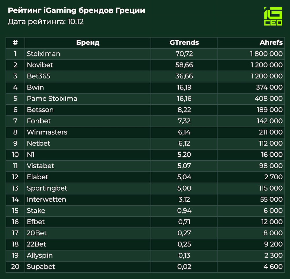 На первом месте казино Stoiximan, второе — Novibet, третье — Bet365. Все три бренда имеют локальную лицензию от Hellenic Gaming Commission (HGC).