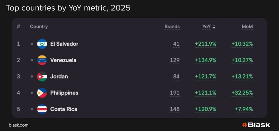 На этом фоне подтверждается общий тренд 2025 года: Венесуэла остается одним из самых быстрорастущих рынков iGaming в мире. Индекс Blask Боливарианской Республики вырос на 134,9% год к году, показав второй результат в мире.