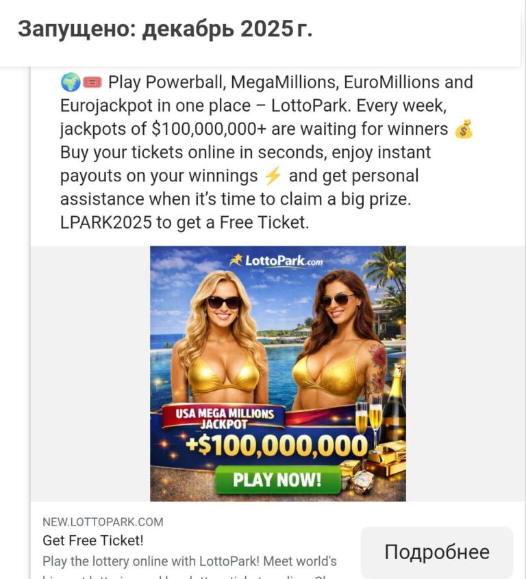 - «LottoPark» с обещанием джекпотов и всяких плюшек (скрин 2). Для FB выглядит невинно, модерка пропускает. Вот только на ленде кроме лото есть еще и слоты (скрин 3), и вообще это «Casino LottoPark».
