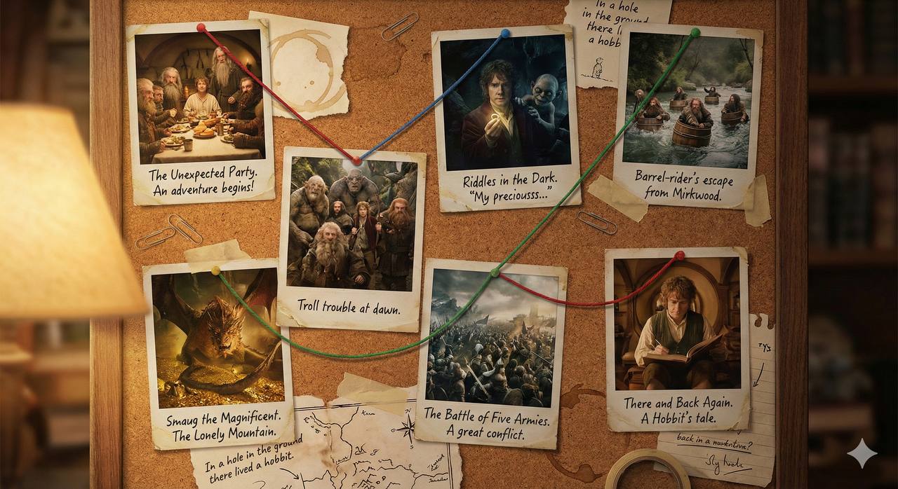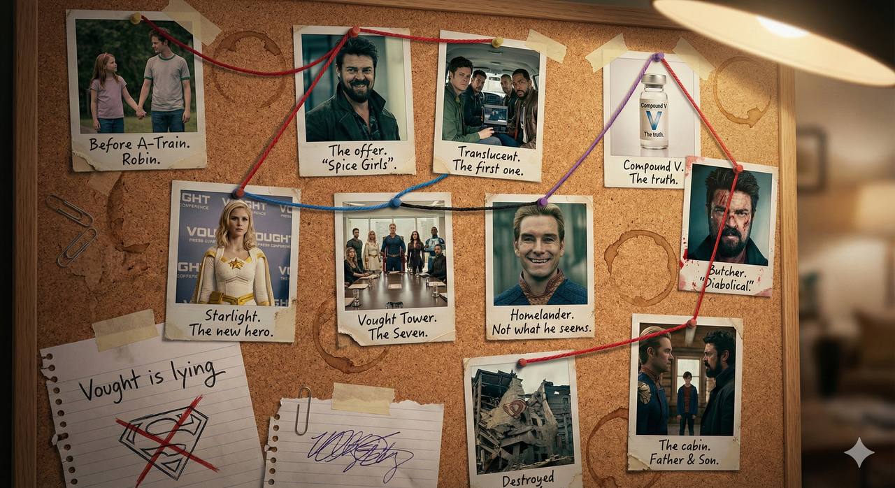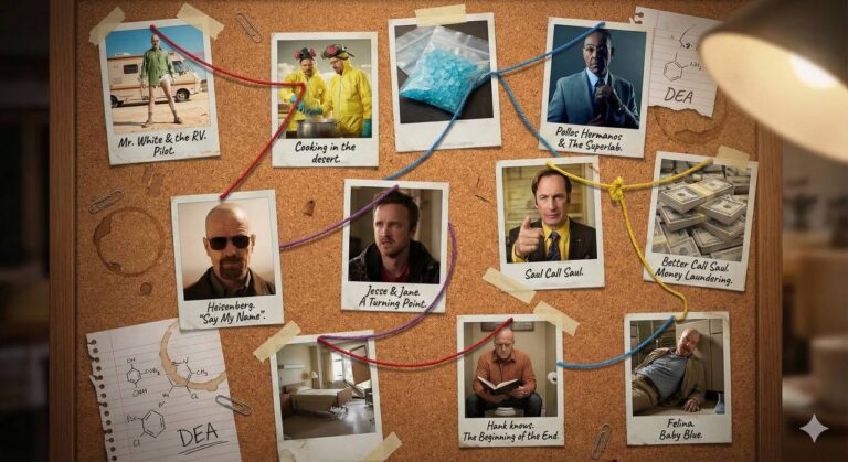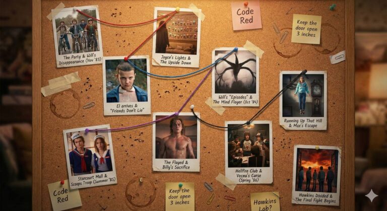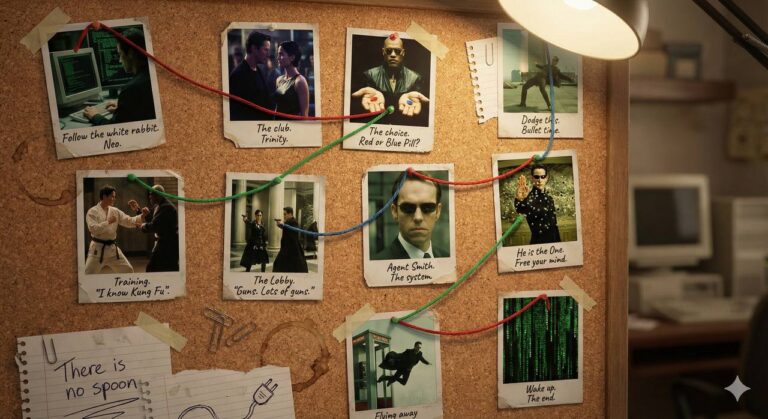 Create an image about [Название фильма/сериала] retold through Polaroid photos pinned to a cork board. Before generating, think step-by-step: extract the key events and main characters, select only the most defining moments of the story. Arrange the Polaroids in a loose chronological path, each showing a core scene with a short handwritten caption underneath. Connect related events with colored strings. Use warm, nostalgic lighting. Add authentic details: coffee rings, paper clips, tape, handwritten notes, worn edges. High clarity, clean composition, cohesive narrative flow.