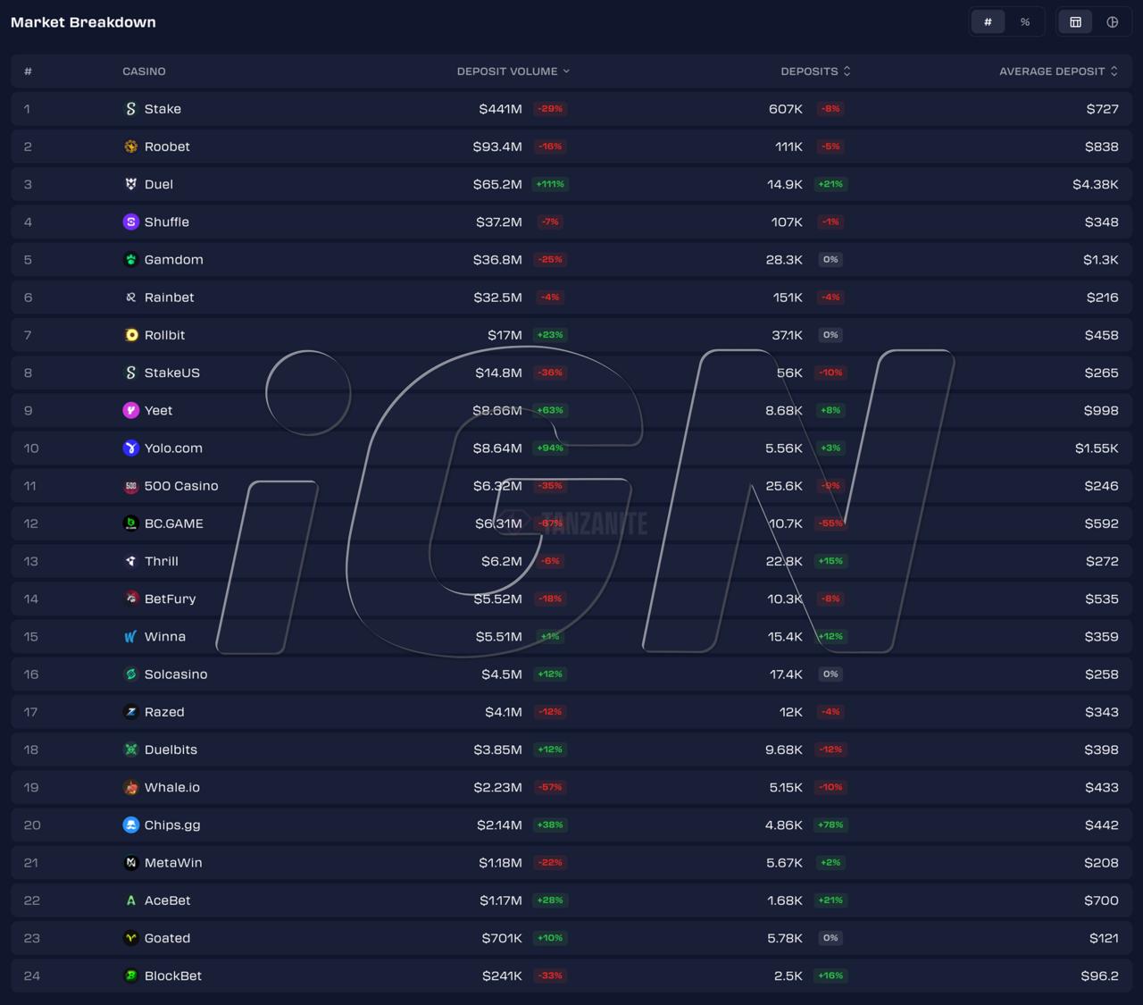 - Gamdom -21,5% ($46,9 млн → $36,8 млн)