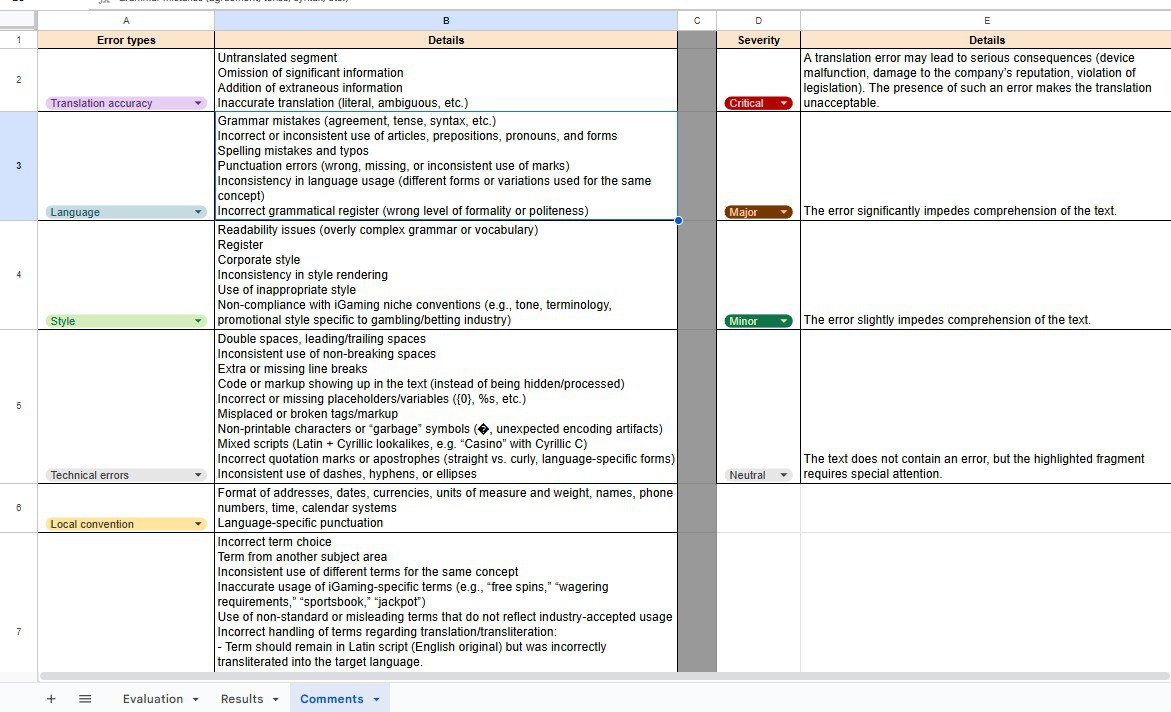 В зависимости от задачи и вида контента редакторы рассматривают каждое предложение или элемент интерфейса — если находят ошибку, то присваивают ей категорию и определяют уровень критичности.