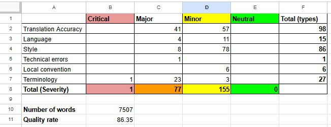 Далее специальная табличка сама сводит все ошибки по типам и критичности и высчитывает объективный показатель качества.