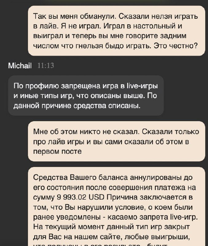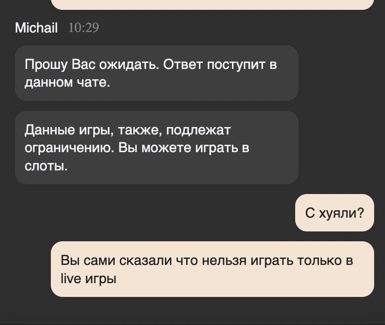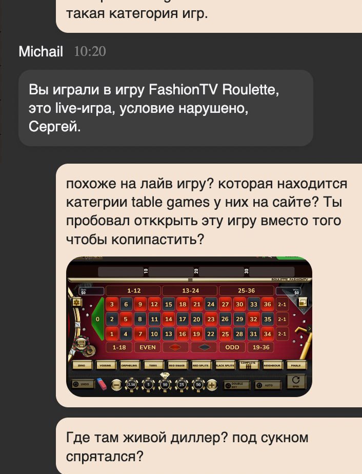 А что будет если игрок сыграет? Что он нарушает? Почему от него требуют не играть в Live-игры? — никто не объясняет. При этом, в чате сообщают, что он спокойно может играть дальше в другие игры, депать и выводить.