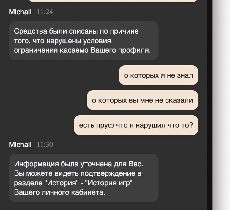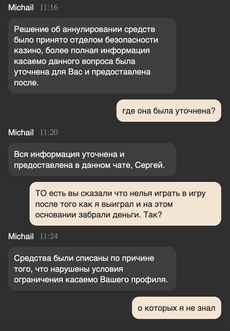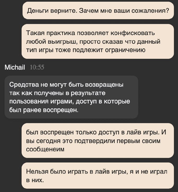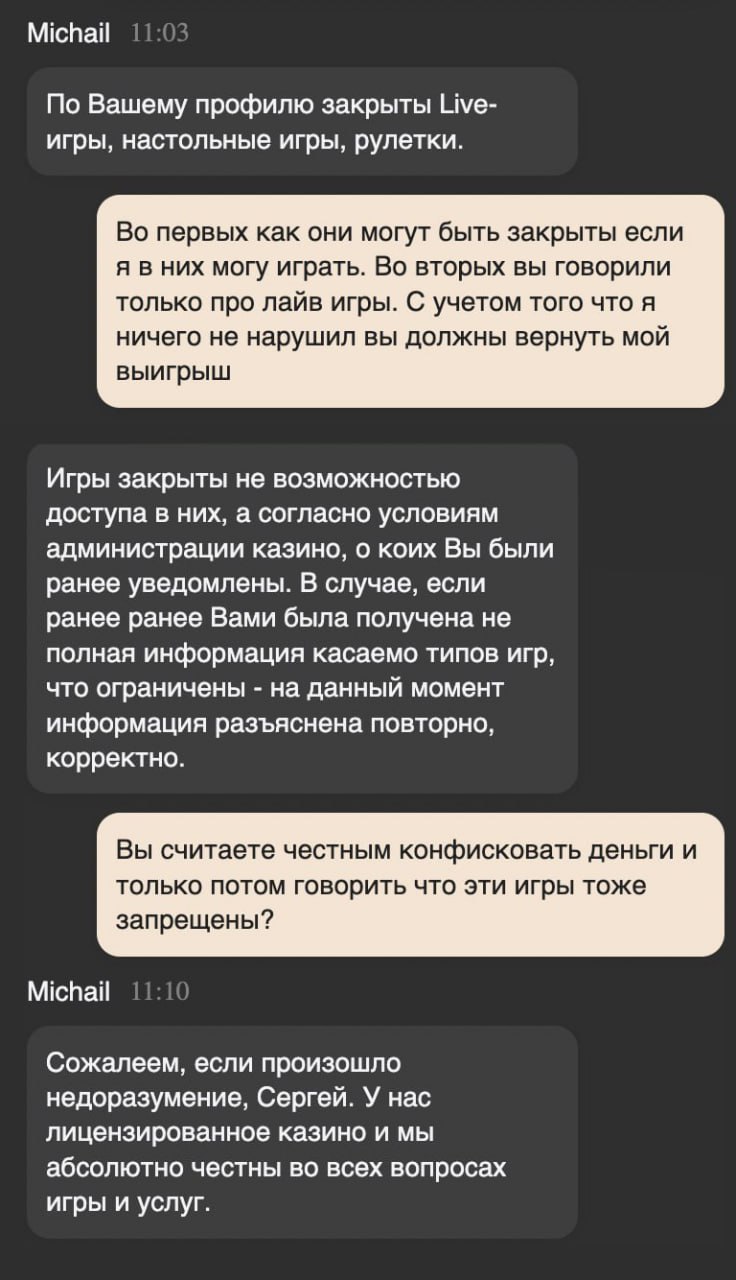Ну и вот сегодня происходит такой диалог, который увидите на скринах. По итогу, у него списали весь его выигрыш, но вернули депозит. Штааа?