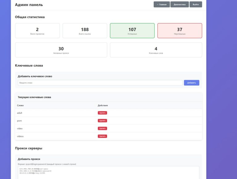 Система представляет собой веб-приложение для автоматической проверки списков ссылок с поддержкой прокси-серверов, поиска ключевых слов и отслеживания внешних ссылок.