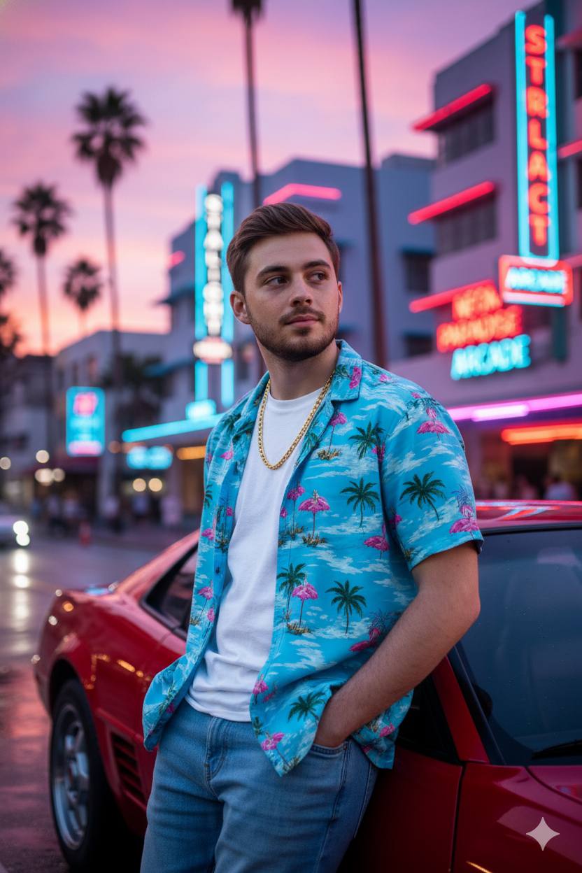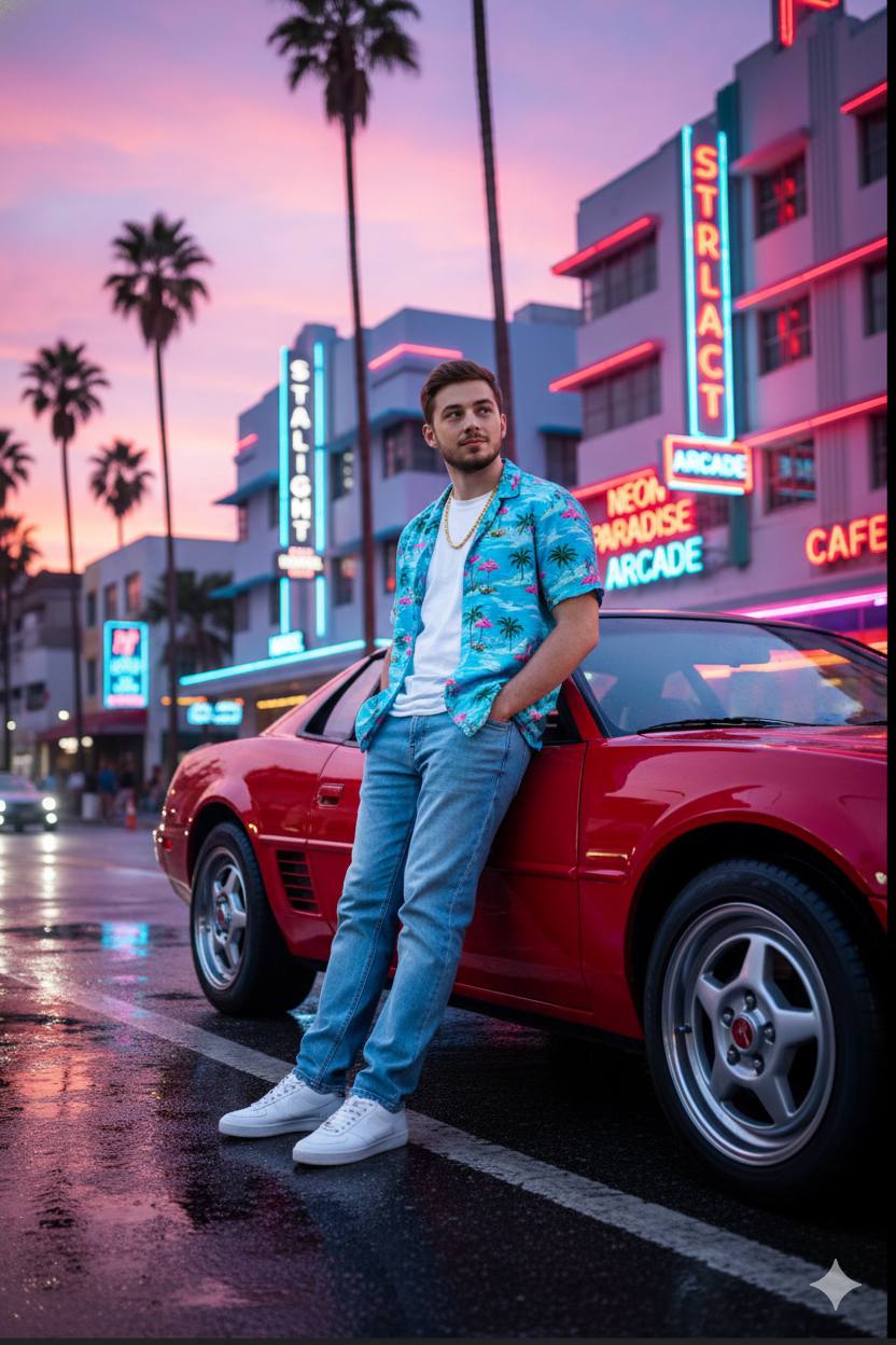 A young man with the exact face from the uploaded selfie — same features, same proportions, same expression, no changes. Dressed like the GTA: Vice City main character, leaning against a retro 1980s sports car under bright neon lights on Ocean Drive. Background: art-deco buildings, palm trees, neon signs, and a pink-purple Miami sunset reflecting on wet asphalt. Neon glow on the car and pavement, soft blur of nightlife in motion. Low-angle cinematic shot, dramatic shadows, ultra-realistic look, strong 1980s Vice City vibe.