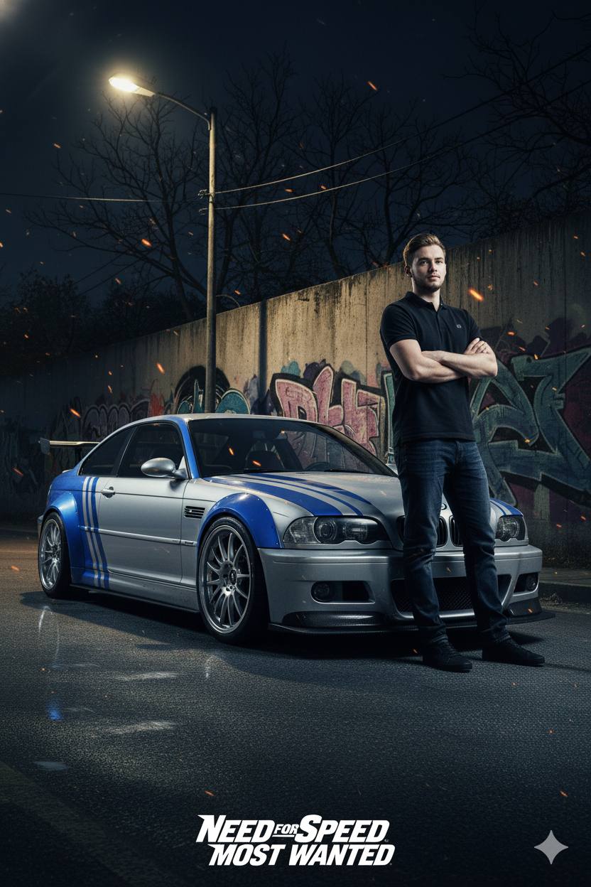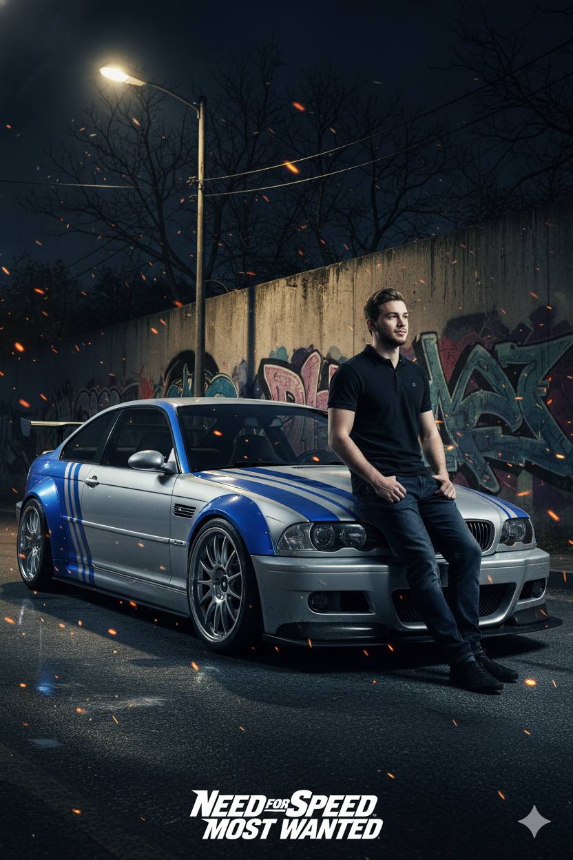 A dynamic street racing scene, cinematic shot. A young man with medium-length hair, wearing a black polo shirt and jeans, leans confidently against the side of a customized BMW E46 M3 GTR. The car is the main focus of the scene. The man is proportionally correct and realistically scaled against the car. The car features a iconic blue and silver livery with white racing stripes, highly polished rims, and an aggressive body kit. In the background, a gritty urban street at night with vibrant graffiti on a concrete wall, bare trees, and power lines. The atmosphere is filled with floating glowing embers and dramatic, moody lighting from a streetlamp, with a high-contrast cinematic color grade. The «Need for Speed: Most Wanted» logo is prominently displayed at the bottom center. Style of a video game cover, edgy and hyper-realistic. Aspect ratio: 9:16.