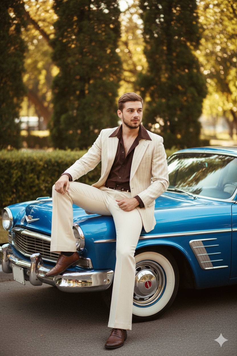 Vintage 1970s Bollywood-inspired photograph, stylish man sitting casually on the hood of a random vintage classic car, royal-colored car (deep maroon, royal blue, emerald green, mustard yellow), chrome details, polished metallic body, wide whitewall tires, sunlight reflections, tall green trees and hedges in background, warm grainy 1970s film tones, retro cinematic vibe, preserve exact face from the input selfie, preserve identity, facial features, skin texture, hairstyle, expression, head shape, body proportions, cream pinstriped blazer, cream bell-bottom trousers, dark brown open-collar shirt (top buttons open), brown formal shoes, confident mafia-style look, natural integration of preserved face with styled body, soft shadows, vintage color palette, subtle film grain, classic analog photography look, sharp focus on face, no beautification, no distortion, no age change, no makeup changes, no facial reshaping, maintain original likeness. Camera: 50mm vintage lens look, shallow depth of field, natural sunlight, slight vignette. Rendering: high detail, crisp edges, realistic textures, cinematic film grain.