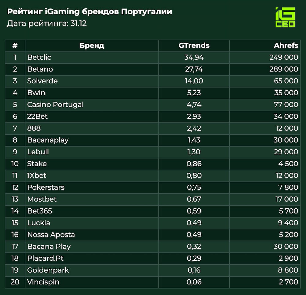 За последние 30 дней было сделано свыше 600 тыс. запросов по топ-20 iGaming брендам Португалии.