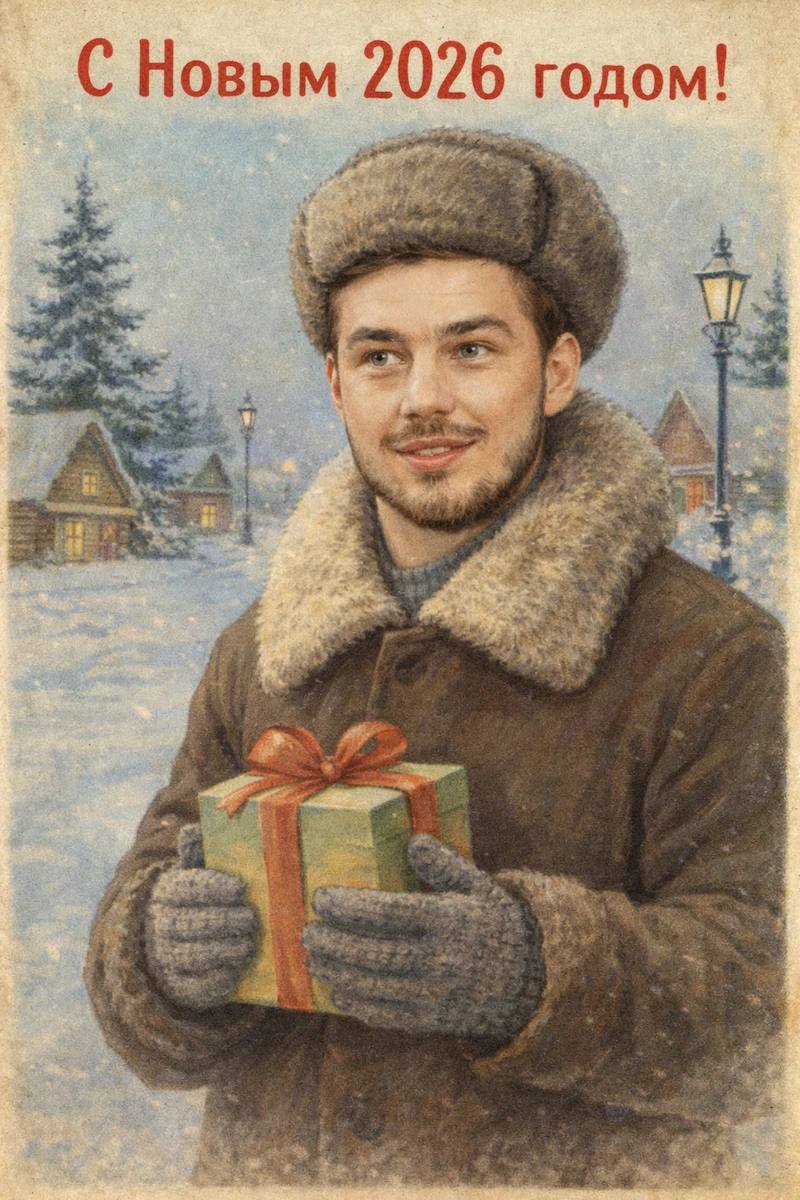 Use the uploaded photo as the ONLY and EXACT facial reference. Preserve facial identity with absolute priority: exact facial geometry, proportions, and likeness. No beautification, no stylization, no changes to the face. If any conflict occurs — preserve the face exactly. Vintage Soviet New Year postcard illustration (1950s–1960s). Young man in a warm winter coat with fur collar, knitted gloves, ushanka. Holding a wrapped New Year gift. Calm, gentle smile. Background: snowy Soviet village street, wooden houses, fir trees, vintage street lamps, winter evening. Style: hand-painted Soviet postcard, muted pastel tones, slightly faded colors, old paper texture. No modern elements. No hyperrealism. Top text: «С Новым 2026 годом!».