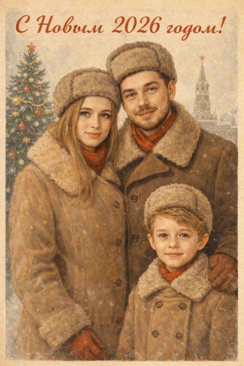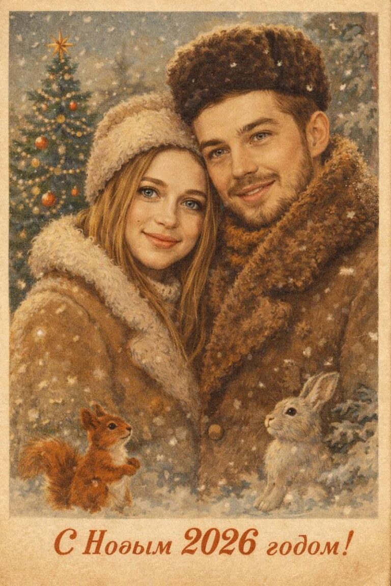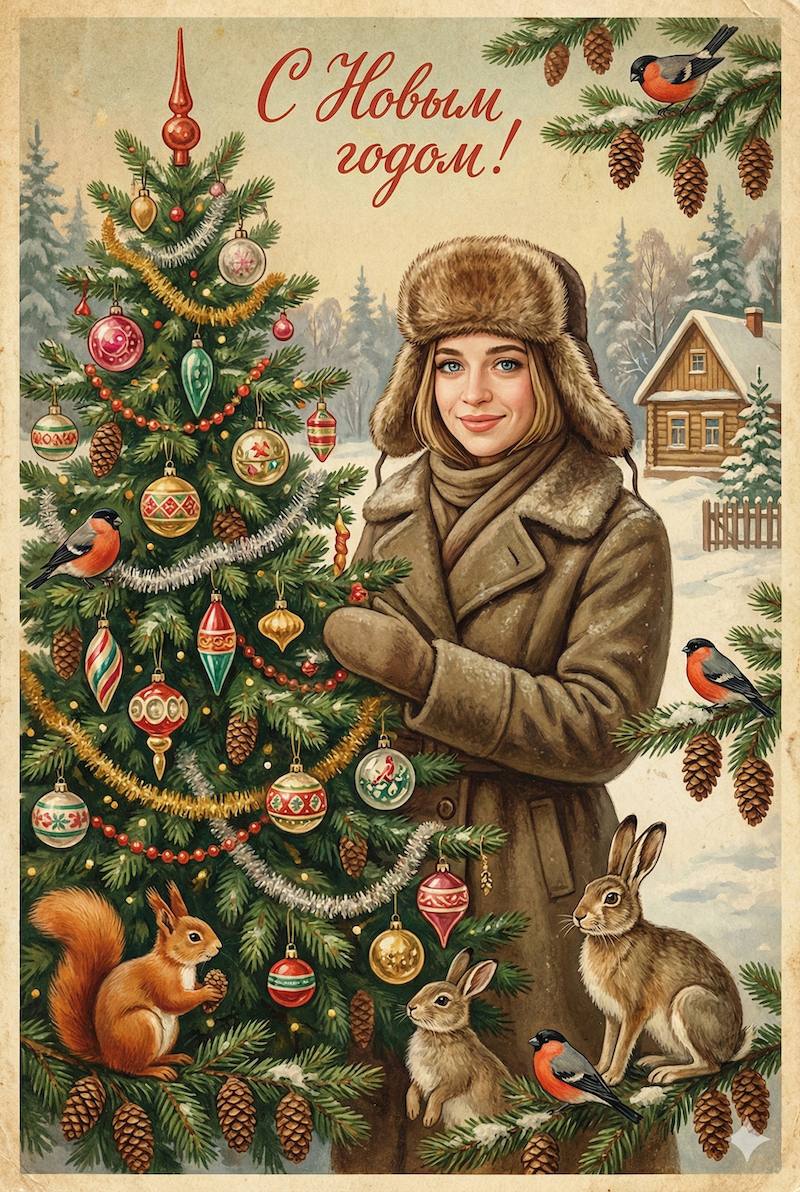 Turn this photo into a vintage Soviet New Year postcard (1950s–1970s USSR). Add a decorated fir tree, forest animals, pine cones. Style: Soviet fairy tales, hand-painted postcard, warm muted colors, aged paper texture. Change the clothing to old Soviet winter clothing, add a classic Soviet ushanka hat. Facial identity: maximum likeness to the reference photo. Exact facial geometry and proportions. No beautification, no changes.