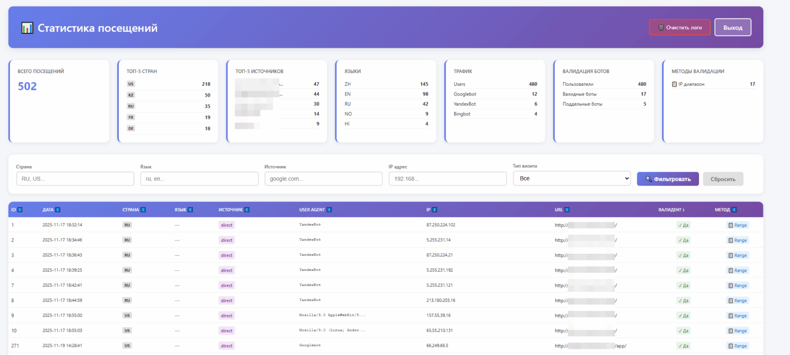 Также на сервере происходит валидация ботов Google, Yandexbot, Bing (в два этапа: по диапазонам, если там нет — то через PTR-запись).