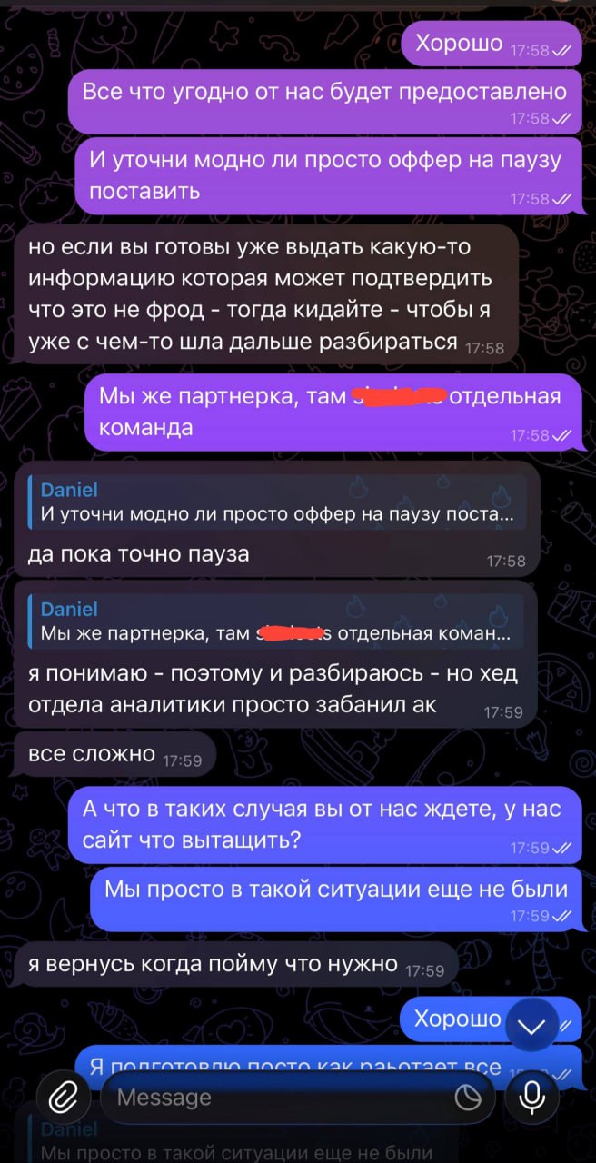 Акк заблокал отдел аналитики, который выявил фрод. Менеджер безрезультатно пыталась добиться от коллег хоть какого-то обоснования. Но те ссылались на сложные, очень точные, лучше, чем у всех алгоритмы, которые нельзя разглашать, потому что, ВНИМАНИЕ, со стороны вебов много фрода. ♂️