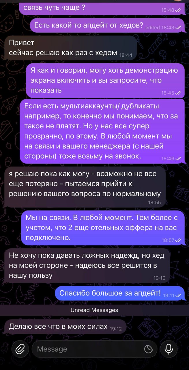 Проливали на Huffson 4 месяца. Сеошку на Германию. Все отлично работало и делали выплаты. Решили, что можем увеличить объемы и мы дали им еще один сайт на сео, гео Германия. И тут нам просто забанили аккаунт.