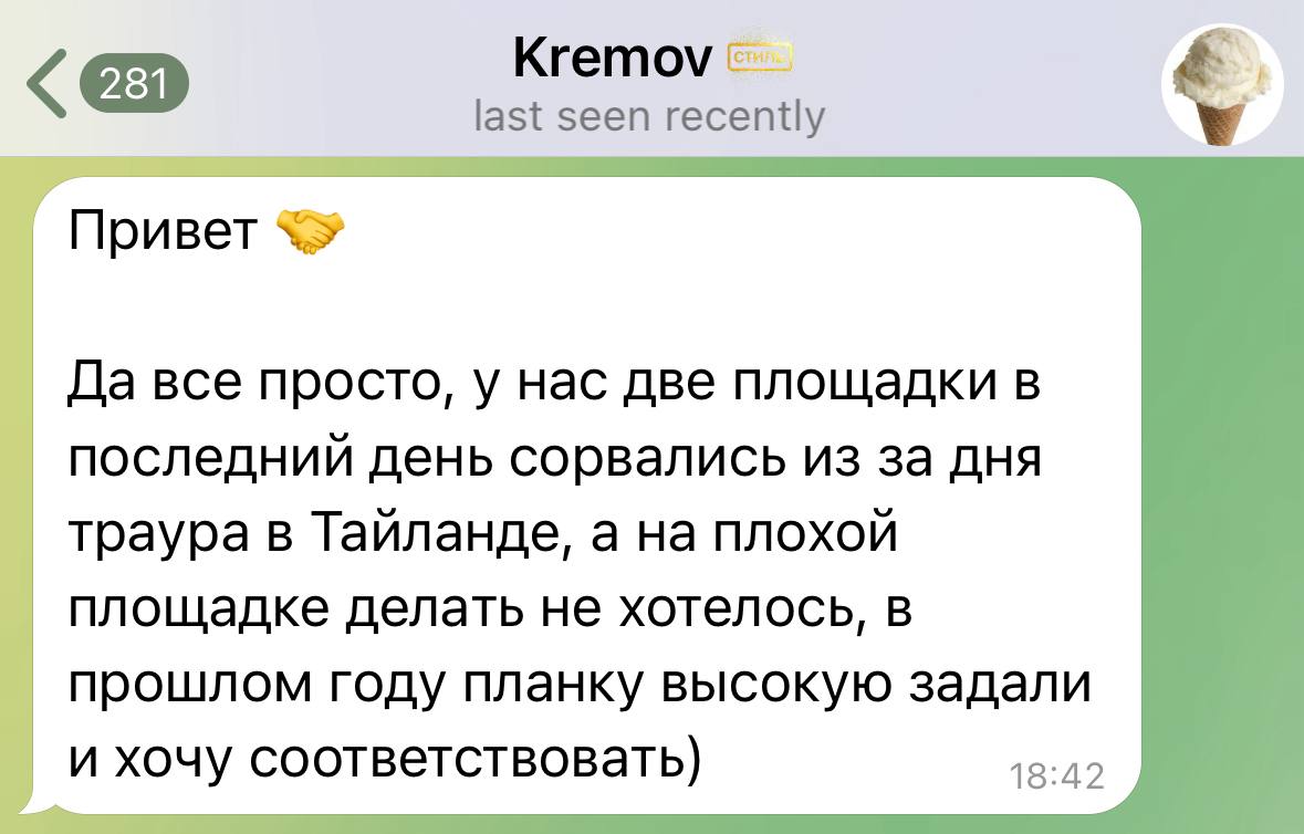 Еще один ивент минуснулся. То ли на фоне слабой организации, то ли на фоне отсутствия денег, но явно не из-за того, что в стране держат траур, как пишет овнер в своих оправдательных сообщениях. Жаль, что решение «вообще ничего не делать, чем делать дерьмово» не пришло Кремову в голову раньше.