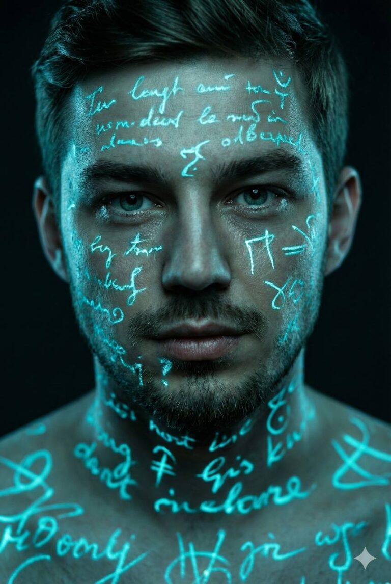 Use the uploaded selfie as the only facial identity reference. Preserve exact facial geometry, proportions, age, skin texture and natural expression. Ultra-realistic close-up portrait of the same man, looking directly into the camera. Glowing cyan handwritten text and abstract symbols projected across the face, neck, and shoulders, light reflections interacting with skin surface only. Dark, minimal background. High contrast lighting. Sharp focus on the eyes. Shallow depth of field. Teal-blue color palette. Photorealistic. Cinematic, dramatic atmosphere.