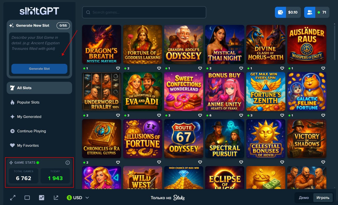 Казино STAKE запустило создание слотов через ИИ. Называется SlotGPT. Находится в списке провайдеров, как отдельный провайдер. Выбрав его мы попадаем в лобби, где можно увидеть, что уже создано порядка 6767 слотов! И только за сегодня почти 2000 штук! Слоты разные, механика тоже разная, максвин х5000 во всех. Можно создать свой слот и играть в него, все ограничивается только вашей фантазией. В самом лобби, на момент написания поста, играло, порядка, 80 человек. Есть правила, не все слоты будут одобрены, совсем уж чернуху не пропустит или удалит. Я прикреплю на скриншотах несколько поделок коллег, про меня слот уже создали ))) Это что-то новенькое, на рынке такого я не встречал, ну что ж… и сюда ИИ добрался!