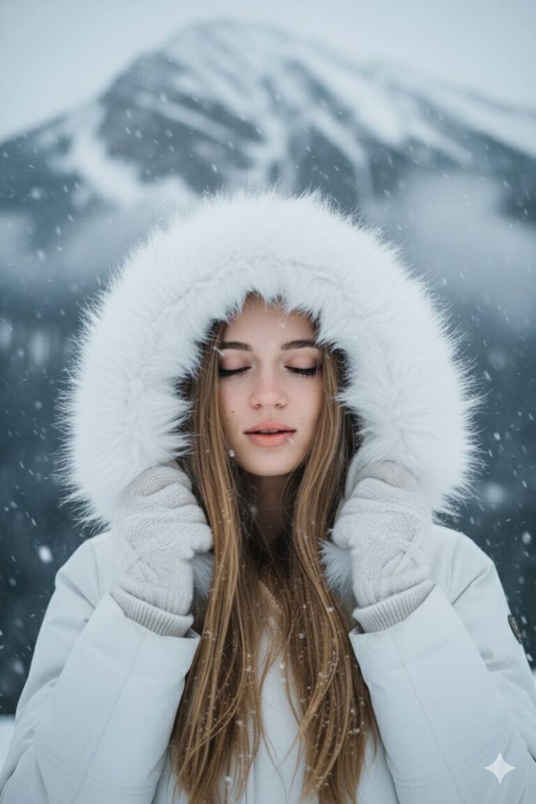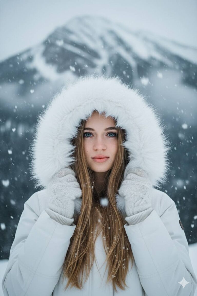 Use the uploaded selfie as the only reference. Keep the exact same face and hair — no changes. Expression: calm, minimal, natural. Create a winter portrait in the mountains during heavy snowfall with large snowflakes. Hair: loose and windswept, moving naturally in the cold wind without covering the face. Outfit: white winter coat with a large fur-lined hood (hood, not a hat); white knit gloves. Pose: the subject slightly opens the fur hood with both hands, holding it wider while facing the camera. Background: a clear mountain ridge with snow-covered peaks, visible dark rocky layers, and light drifting fog. Lighting: cold diffused daylight. Color grading: subtle cinematic tone with cool hues and soft contrast. Camera: 4:5 ratio, mid-portrait framing.