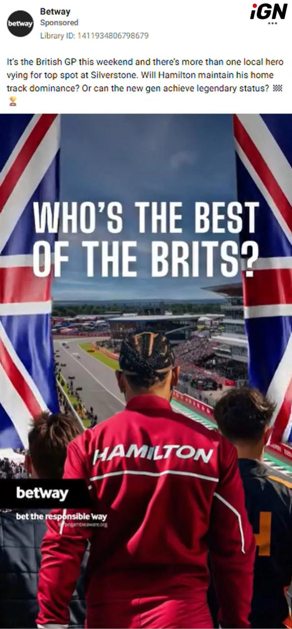 Британский рекламный регулятор ASA 3 декабря запретил рекламу оператора «Betway» в «Facebook» от 4 июля 2025г. В ролике были продемонстрированы три пилота Формулы-1, стоящих спиной к камере, у одного из них на комбинезоне значилась фамилия Хэмилтона.