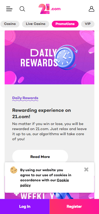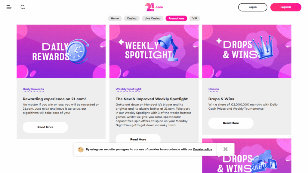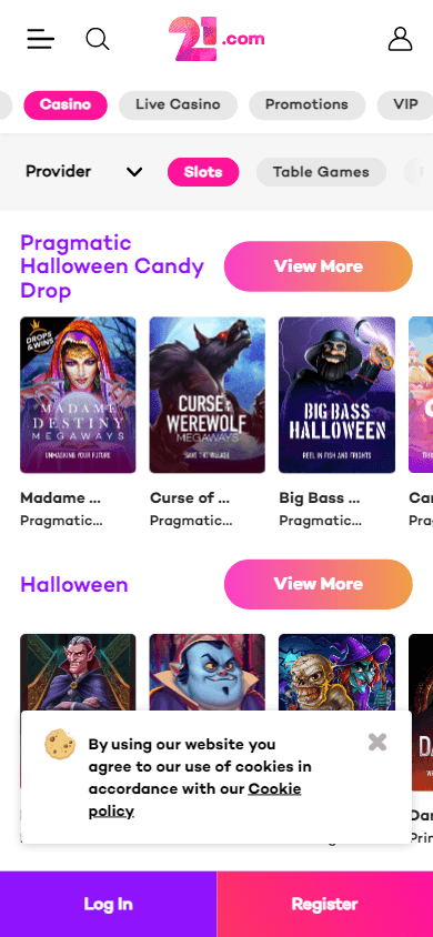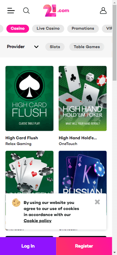 21.com располагает своим лобби с минималистичным интерфейсом, где легко ориентироваться даже начинающему. Здесь собраны игры от 98 поставщиков, включая NetEnt, Microgaming, Play’n GO, Evolution Gaming, Quickspin, Red Tiger и Pragmatic Play: приезжие слоты, карточные и настольные игры, лайв-казино с живыми дилерами, видеопокер, бинго, краш-игры, а также шоу-игры. Демонстрационный режим доступен и на мобильных устройствах, равно как и полноценный доступ к функционалу казино через сайты на разных языках, включая русский, английский, финский и немецкий.