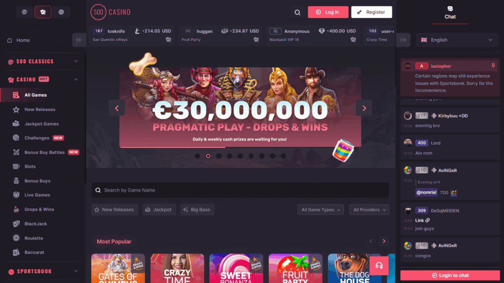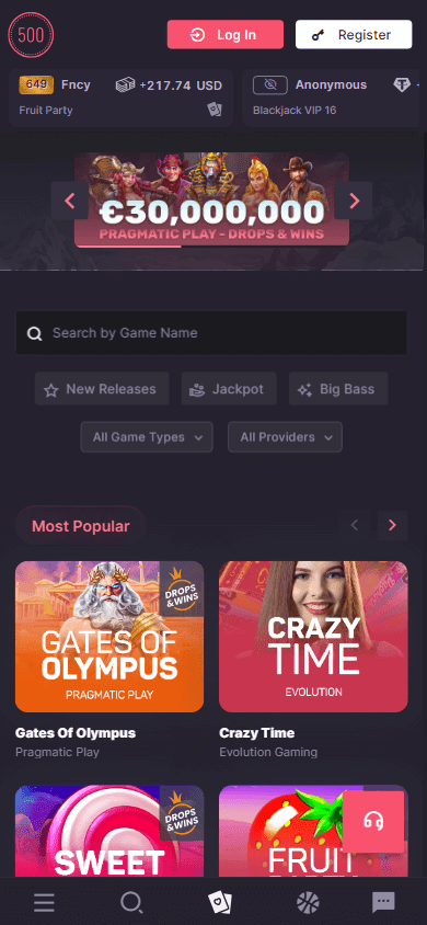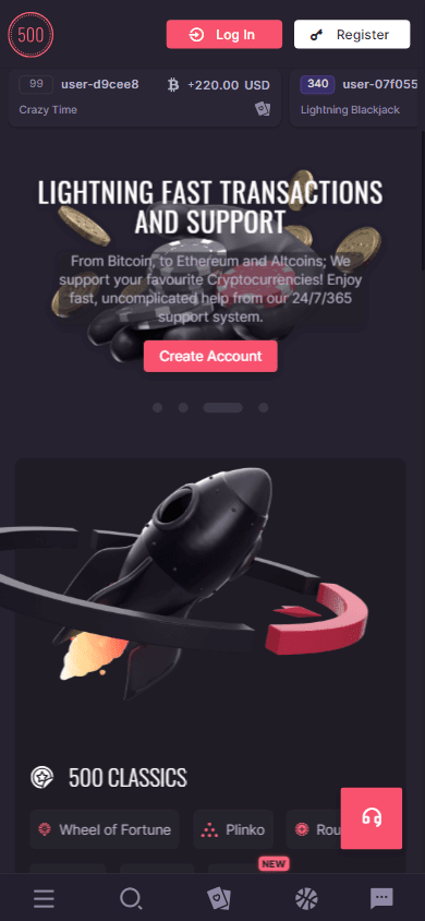 В игровом портфолио представлено свыше 4000 развлечений от 44 поставщиков. Пользователям доступен богатый выбор слотов, настольных и лайв-игр, видеопокер, бинго, крэпс, скретч-карты, краш-игры, а также внутренние “500 Classics” (Plinko, Wheel of Fortune и др.). Особенно отмечают качественную фильтрацию игр, быстрый поиск по провайдерам и наличие собственных оригинальных продуктов.