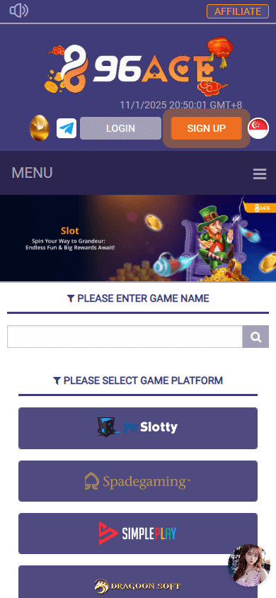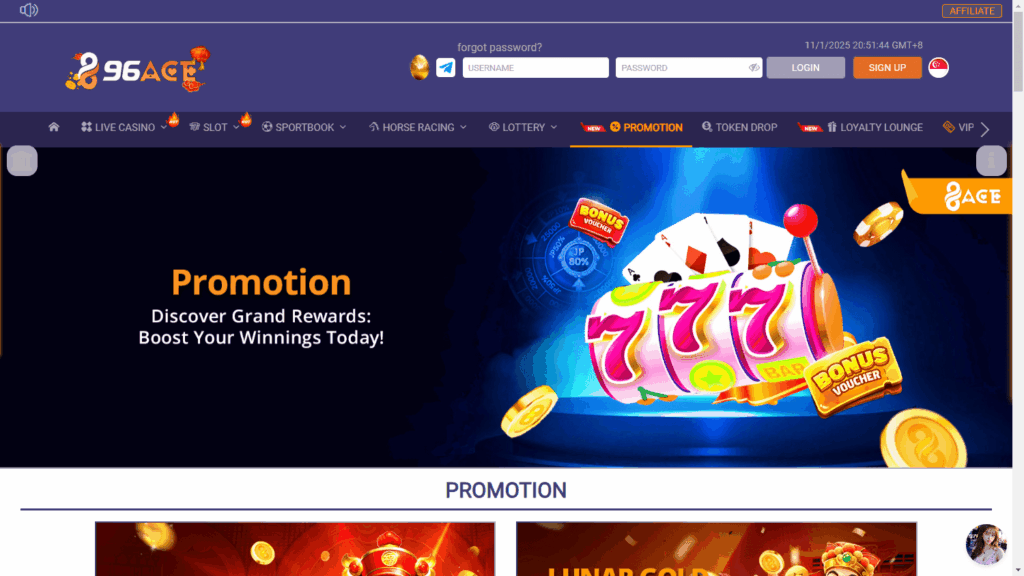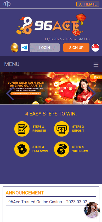 96ACE – онлайн-казино без лицензии, ориентированное главным образом на игроков из Малайзии и Сингапура, с акцентом на eSports и широкий набор способов пополнения, включая криптовалюты. Казино принадлежит компании с нераскрытым владельцем и работает преимущественно на азиатский рынок. Из характерных особенностей можно отметить оформление сайта, адаптированное под местную аудиторию, а также активное присутствие в социальных сетях Facebook, Twitter и Instagram.