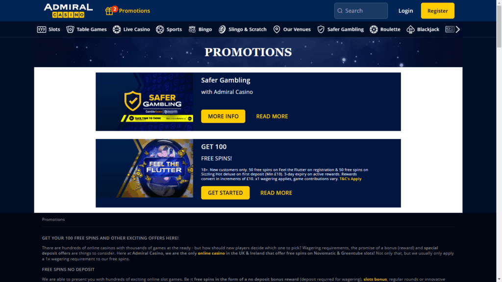 Admiral Casino предлагает приветственные бонусы и сезонные акции – подробности представлены в специальном разделе сайта. Все основные условия акций и бонусных программ прозрачно описаны без «подводных камней». Основная аудитория – постоянные игроки из Великобритании и Ирландии, других стран доступ нет.