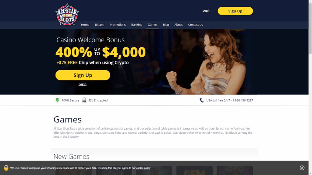 С точки зрения ассортимента игр All Star Slots отличается скромным выбором: используются только два провайдера (Realtime Gaming и Visionary iGaming), однако, доступны не только слоты, но и разновидности рулетки, блэкджека, видеопокера, баккары, кено, джекпоты и живые дилеры. Такой подход ограничивает разнообразие, но упрощает навигацию и делает интерфейс понятным для новичков. Любители нестандартных решений оценят удобство работы с криптовалютами: помимо Bitcoin, поддерживаются Ethereum, Litecoin, Tether, USD Coin и Binance Coin.