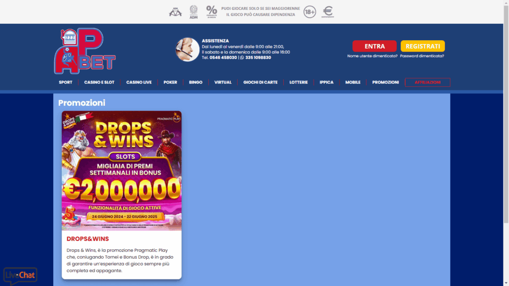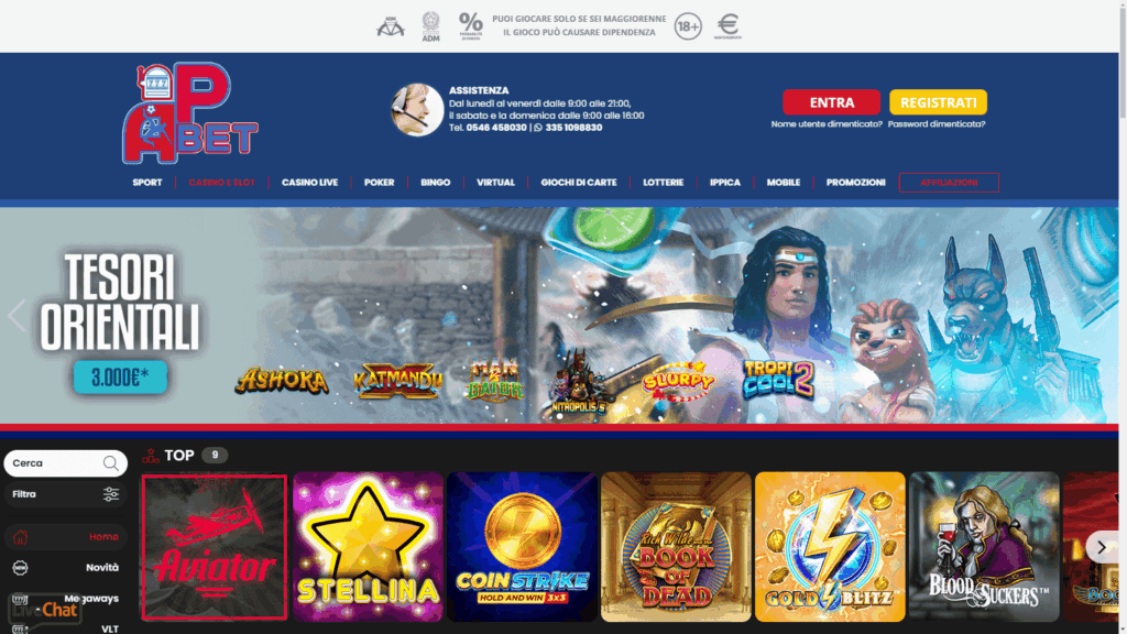Apbet – это онлайн-казино, ориентированное на игроков из Италии и работающее по лицензии местного регулятора. Ключевые особенности площадки – строгая приверженность честным условиям, минимальное количество жалоб со стороны клиентов и широкий спектр игр от ведущих мировых провайдеров. Регистрация доступна только при наличии итальянской карты фискального кода, что ограничивает аудиторию, но обеспечивает дополнительную защиту интересов игроков.