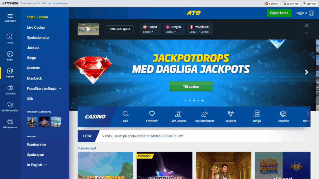 ATG Casino – онлайн-казино средних размеров с акцентом на безопасность, прозрачные условия и широкий выбор игр от ведущих провайдеров. Основное направление деятельности компании – спортивные ставки, но игровой раздел охватывает все основные жанры для любителей слотов, настольных и живых игр. Владельцем и оператором платформы выступает шведская компания AB Trav och Galopp с лицензией Spelinspektionen, что напрямую влияет на уровень доверия и прозрачности работы этого оператора.