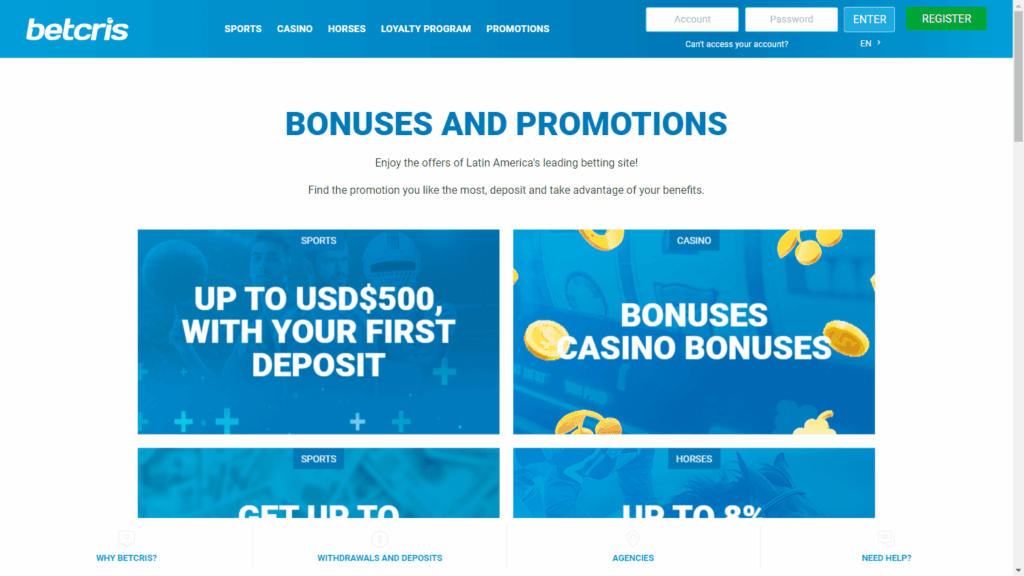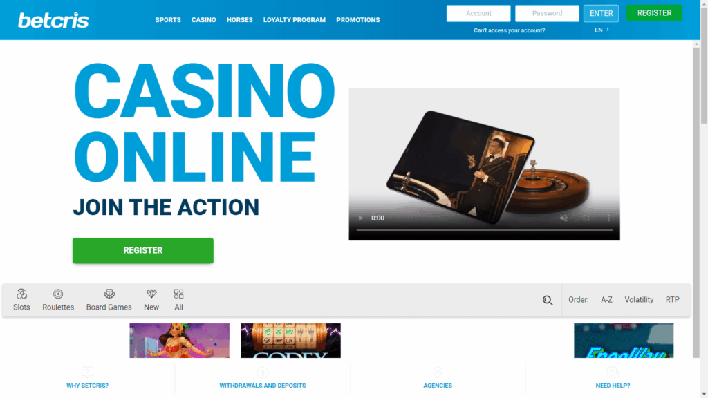 Betcris – онлайн-казино, ориентированное на игроков из Латинской Америки, сочетающее обширные возможности ставок на спорт с ограниченной, но качественной коллекцией казино-игр, лицензировано Malta Gaming Authority и отличается высоким уровнем безопасности для игроков.