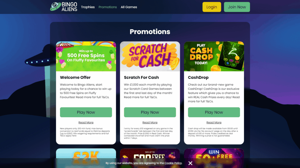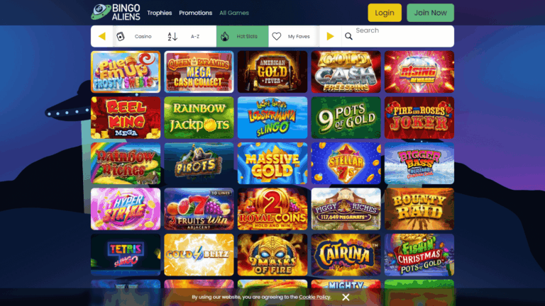 Bingo Aliens – онлайн-казино, ориентированное на британскую аудиторию и предлагающее широкий выбор игр, честные условия и множество способов оплаты, включая PayPal. Сразу после первого депозита игрок получает бесплатный спин на “Mega Wheel”, где можно выиграть фриспины или сертификаты Amazon, что выделяет данный сайт среди небольших казино Великобритании.