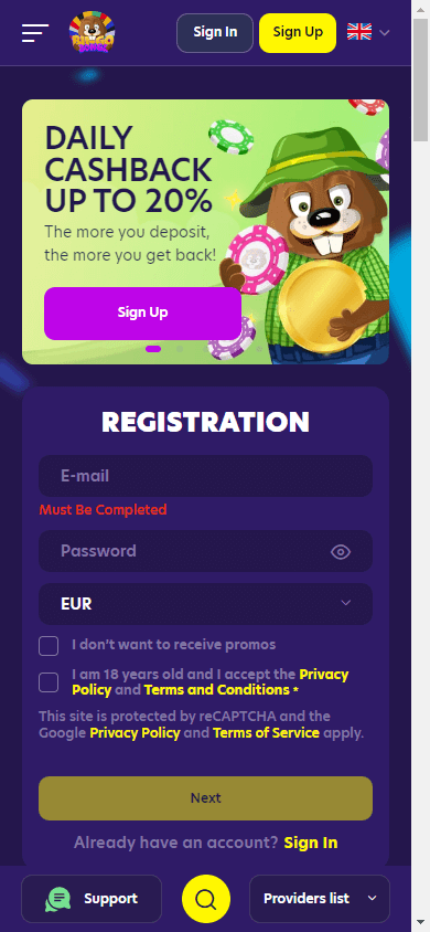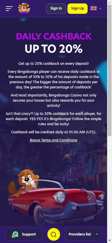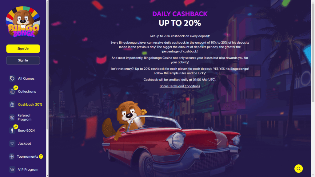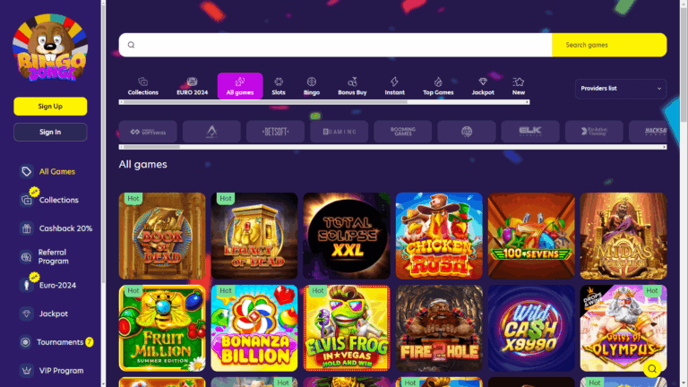 Bingo Bonga – онлайн-казино с мгновенной регистрацией по модели Pay N Play и расширенной поддержкой игровых и платежных функций. Главные отличия – внушительная коллекция автоматов, низкие требования к отыгрышу бонусов и высокий индекс безопасности по оценке независимых экспертов.