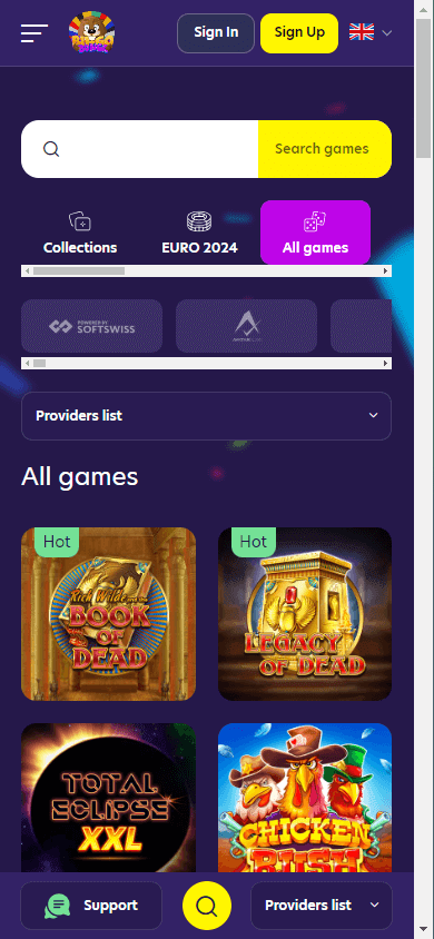 Игровая библиотека насчитывает свыше 80 разработчиков и тысячи слотов, настольных игр, live-дисциплин, видеопокер, bingo, дилеры в режиме реального времени, авторские джекпоты с несколькими уровнями (серебро, золото и бриллиант), турниры по слотам и розыгрыши ежедневных бонусов. Есть программы лояльности, ежедневный кешбэк с низким вейджером и опция моментальных бонусов. Минус – live-игры и некоторые разделы не учитываются при выполнении требований по отыгрышу.