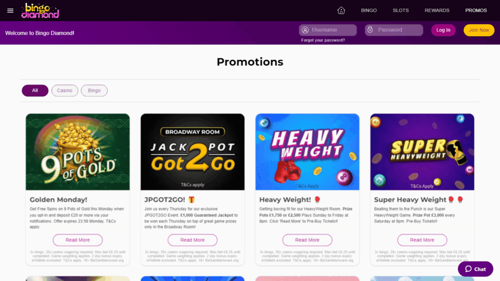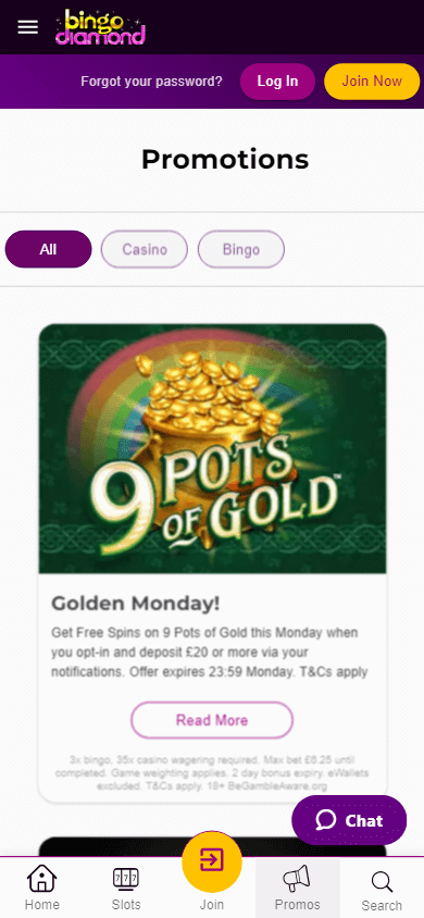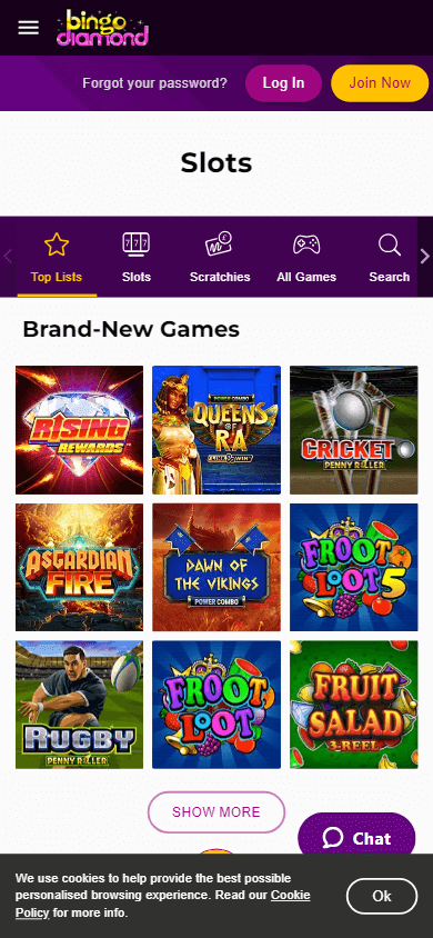 Bingo Diamond принадлежит компании Broadway Gaming Ltd., лицензировано Комиссией по азартным играм Великобритании и работает преимущественно на аудиторию Великобритании и Ирландии. Казино предлагает широкий выбор популярных игровых автоматов, джекпотов, скретч-карт и, конечно же, множество бинго-игр. В портфеле более 25 провайдеров, среди которых Pragmatic Play, Games Global и SpinPlay Games, но провайдера для фильтрации выбрать невозможно. Любители live-игр не найдут здесь live-дилеров – эта категория отсутствует.