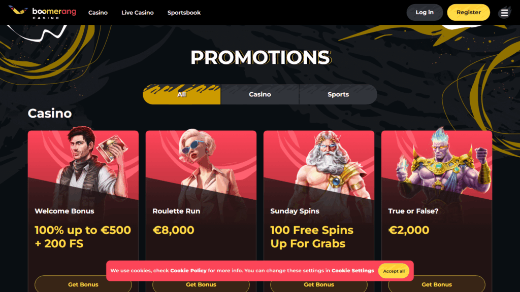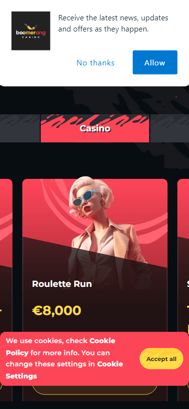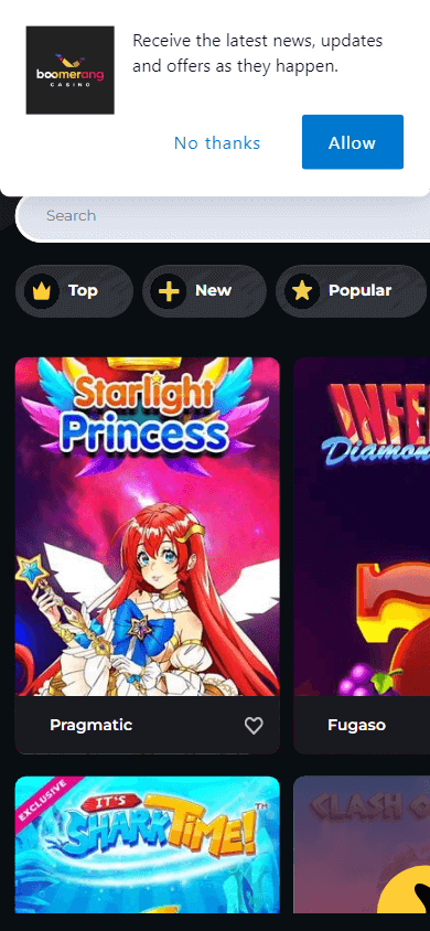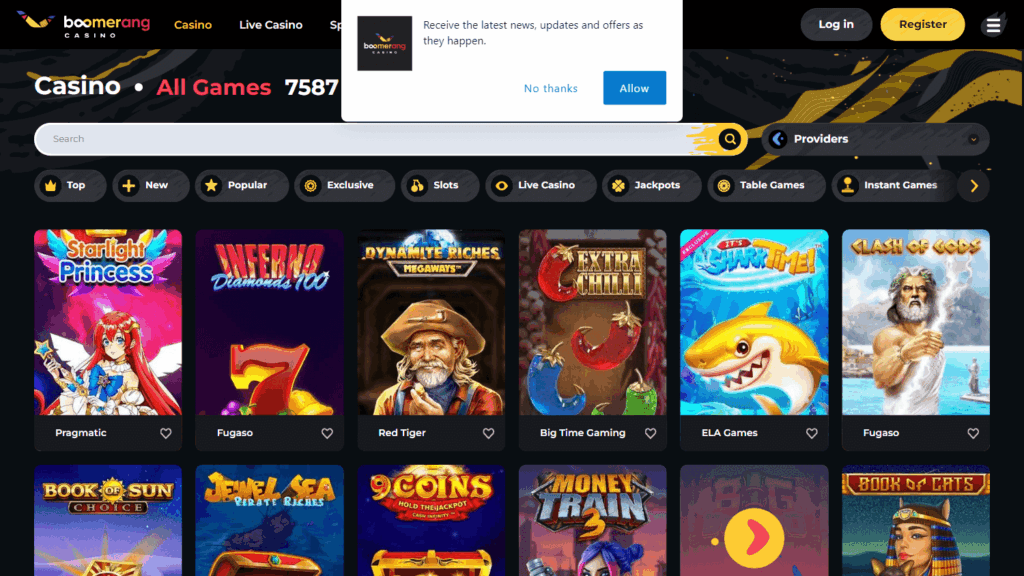 Игровой зал Boomerang включает более 120 провайдеров, среди которых NetEnt, Pragmatic Play, Evolution, Playtech и многие другие крупнейшие бренды индустрии. Доступны все основные типы развлечений: слоты, настольные и карточные игры, live casino, ставки на киберспорт и виртуальный спорт. Категоризация и навигация интуитивны: игры легко сортируются по провайдерам и жанрам, что экономит время. Для тех, кто привык к большому выбору, здесь созданы все условия – десятки турниров, эксклюзивные предложения для постоянных игроков, регулярные акции.