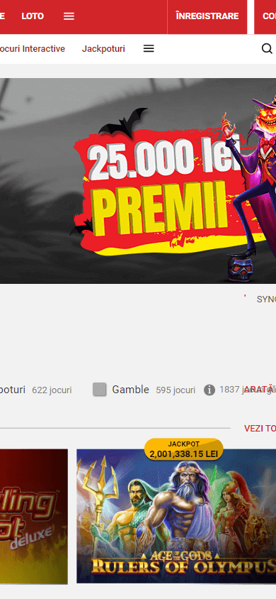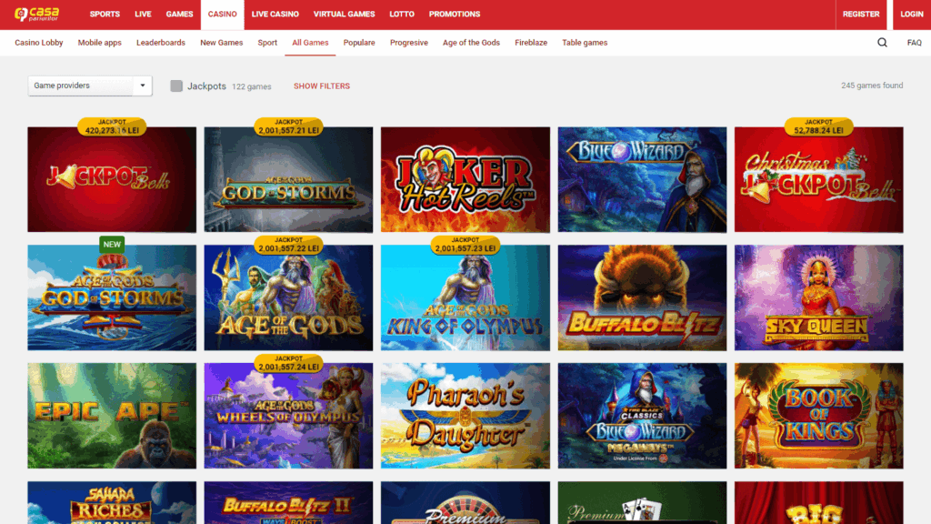 Casa Pariurilor – это платформа, объединяющая онлайн-казино, букмекерские услуги и лотереи, а дополнительное доверие создает поддержка наземных казино и спортивных баров. Компания принадлежит Hattrick PSK d.o.o., имеет годовой оборот более $5 млн и работает по лицензии Румынии. Все операции доступны исключительно для резидентов этой страны. Ассортимент игр впечатляет: более 30 провайдеров, включая NetEnt, Novomatic, Evolution Gaming, Playtech, Pragmatic Play, Yggdrasil, Microgaming и других. В каталоге представлены слоты, настольные игры, ставки на спорт, виртуальные виды спорта и кено, а также live-казино, crash-игры, бинго и лотереи.