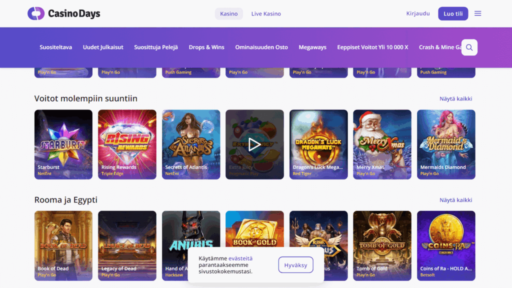 Ключевая особенность Casino Days – внушительный выбор игр, включая слоты из самых популярных серий, множество вариантов рулетки, покера, блэкджека, live-дилеров и редких жанров. Реализована поддержка игр от NetEnt, Pragmatic Play, Play’n GO и других крупных студий, что гарантирует высокое качество интерфейса и корректное функционирование генератора случайных чисел. Играть можно как в браузере, так и на большинстве мобильных устройств, включая Android и iOS.