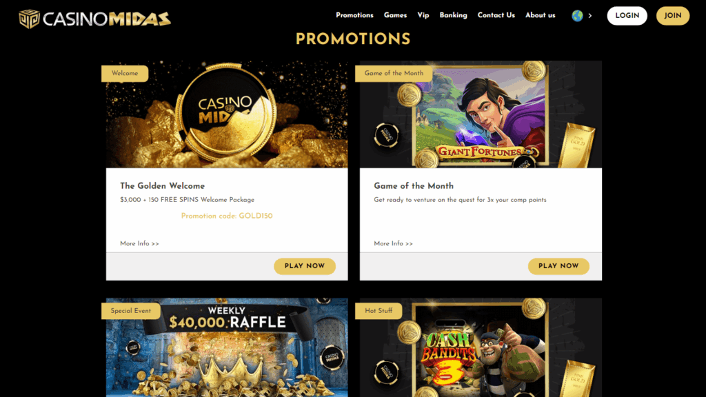 Casino Midas – онлайн-казино на платформе RTG с поддержкой криптовалют и круглосуточной службой поддержки. Это заведение позиционирует себя как площадку для поклонников слотов, карточных и настольных игр, а также предоставляет доступ к live-играм лишь после регистрации.