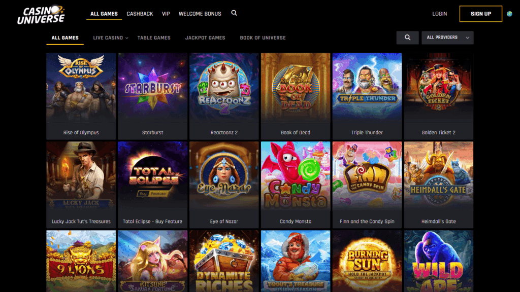 Ассортимент игр Casino Universe насчитывает слоты, рулетку, блэкджек, карточные, живые дилеры и джекпоты – свыше двух десятков производителей, включая NetEnt, Evolution, Play’n GO, Pragmatic Play, Quickspin, Yggdrasil. Все основные жанры представлены в полном объеме, удобно реализованы фильтры по провайдерам и поиск по названию. Live-казино работает круглосуточно, включая популярные продукты Evolution Gaming и реальные шоу.