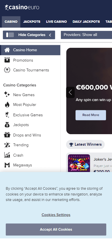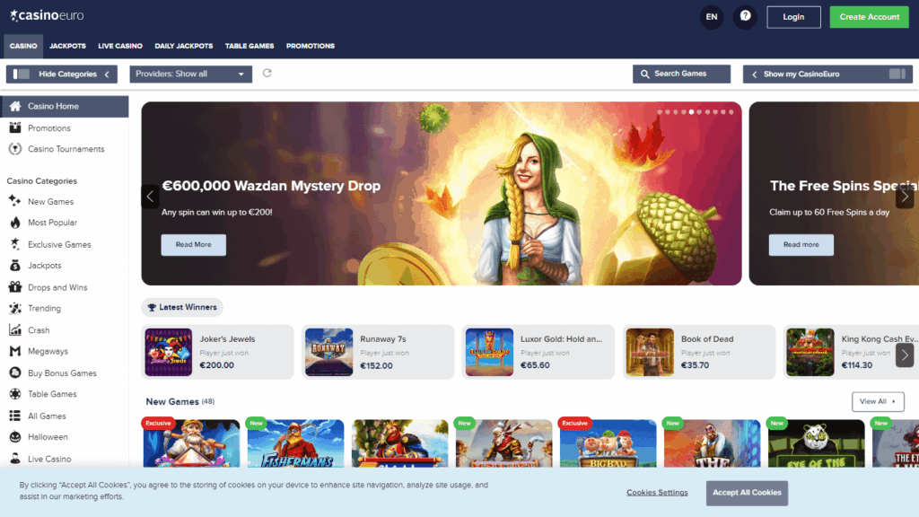 Сильная сторона CasinoEuro – это ассортимент: пользователям доступно более четырех тысяч слотов, рулетка, различные версии покера и блекджека, краш-игры и сотни live-столов с реальными дилерами. Работает со 185 игровыми провайдерами, включая NetEnt, Play’n GO, Pragmatic Play, Evolution, Yggdrasil, Novomatic, что гарантирует доступ к актуальным и популярным тайтлам. Live-казино и прогрессивные джекпоты привлекают немалую часть постоянной аудитории, а турниры с призовыми без требований по отыгрышу дополнительно мотивируют участников.